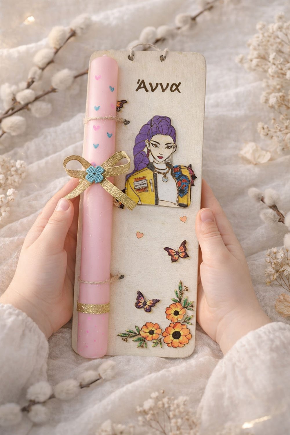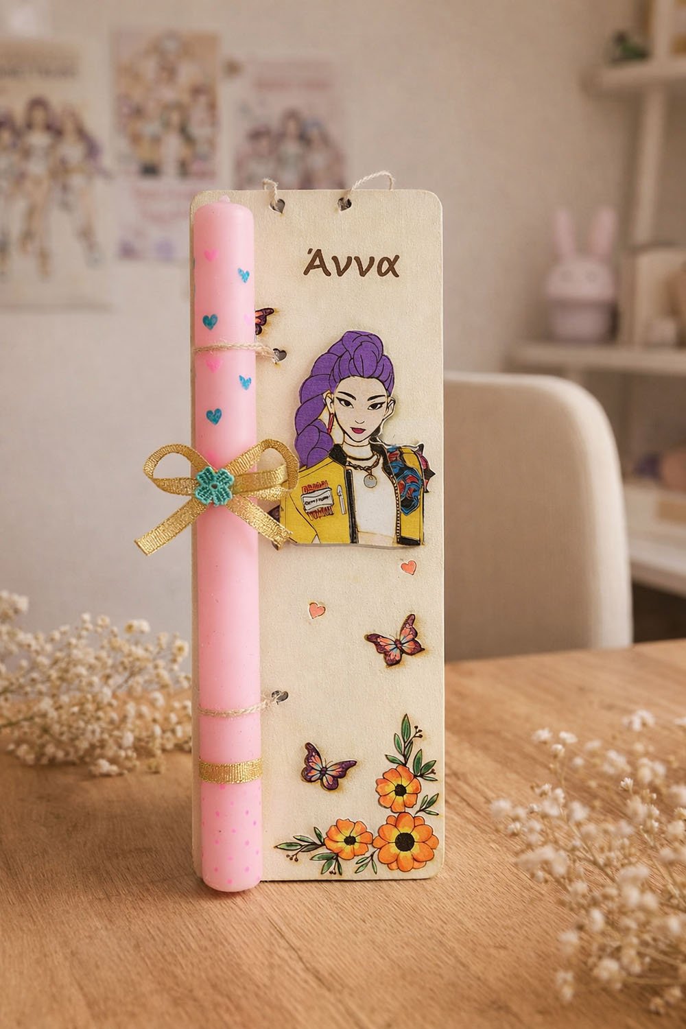 Αρωματική πασχαλινή λαμπάδα Kpop Demon Hunters Huntrix με όνομα παιδιού και ξύλινη πλάτη που γίνεται διακοσμητικό για το δωμάτιο. Υπάρχει δυνατότητα να προστεθεί προσωπική αφιέρωση χαραγμένη στην πίσω πλευρά της ξύλινης πλάτης !