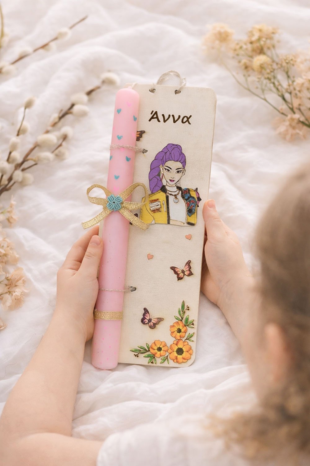 Το όνομα του παιδιού χαράσσεται επάνω στην ξύλινη πλάτη, κάνοντας τη λαμπάδα μοναδική και προσωπική 🎀