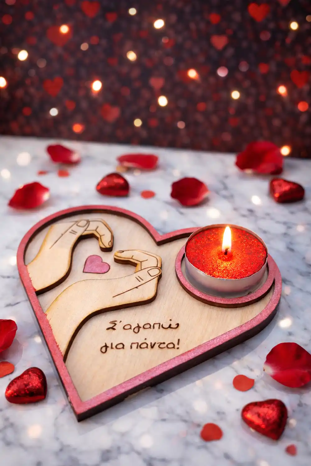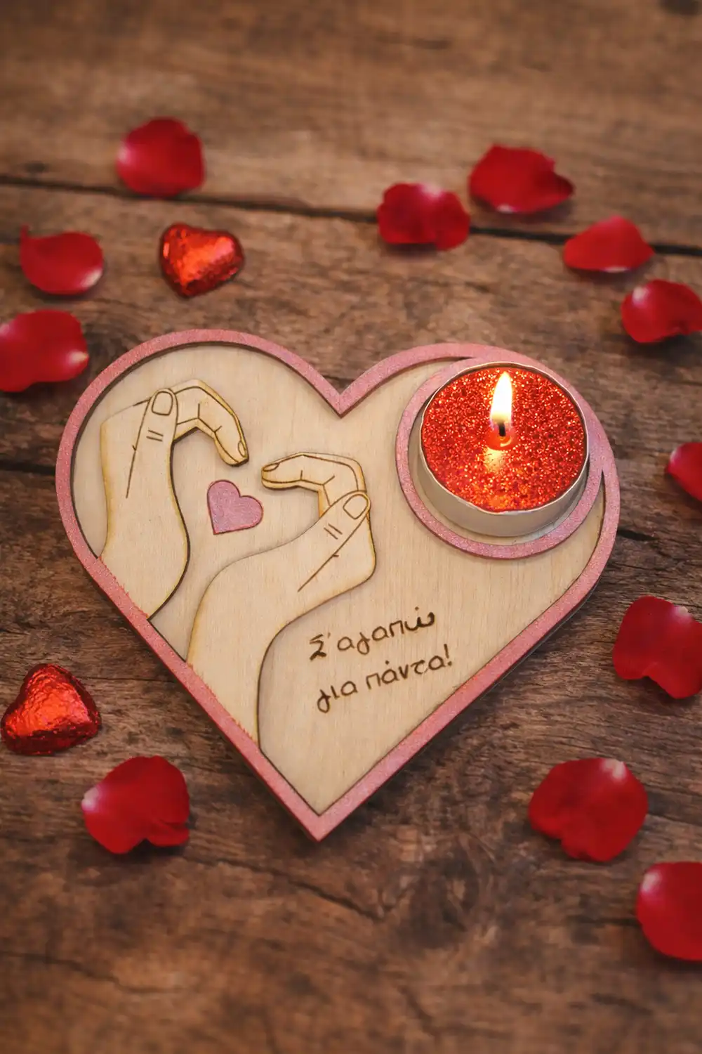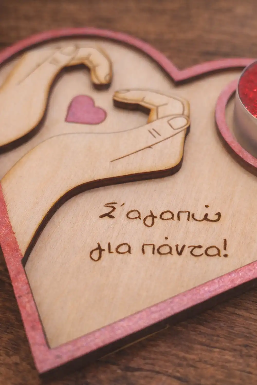Η ξύλινη βάση ρεσό σε σχήμα καρδιάς με το μήνυμα «Σ’ αγαπώ για πάντα» και το σχέδιο με τα χέρια που σχηματίζουν καρδιά, δημιουργεί μια τρυφερή εικόνα αγάπης και υπόσχεσης 💕