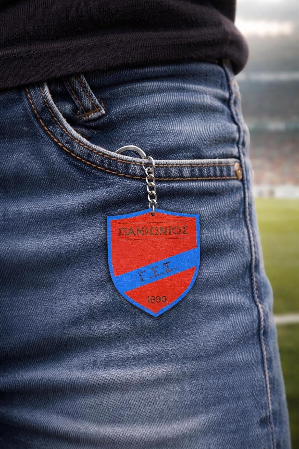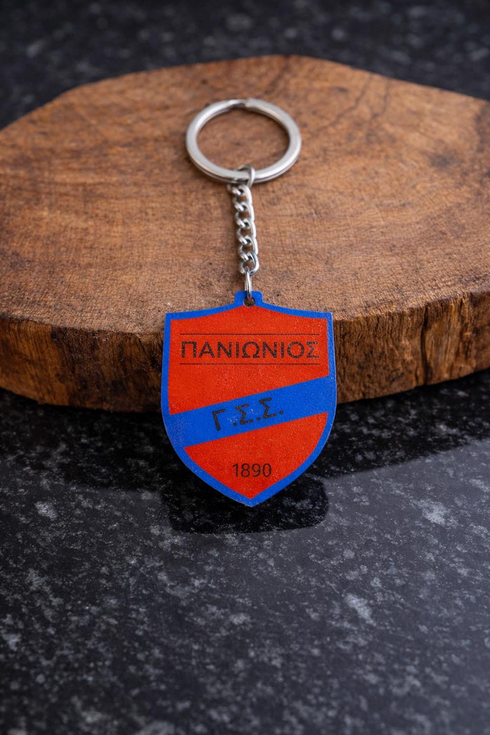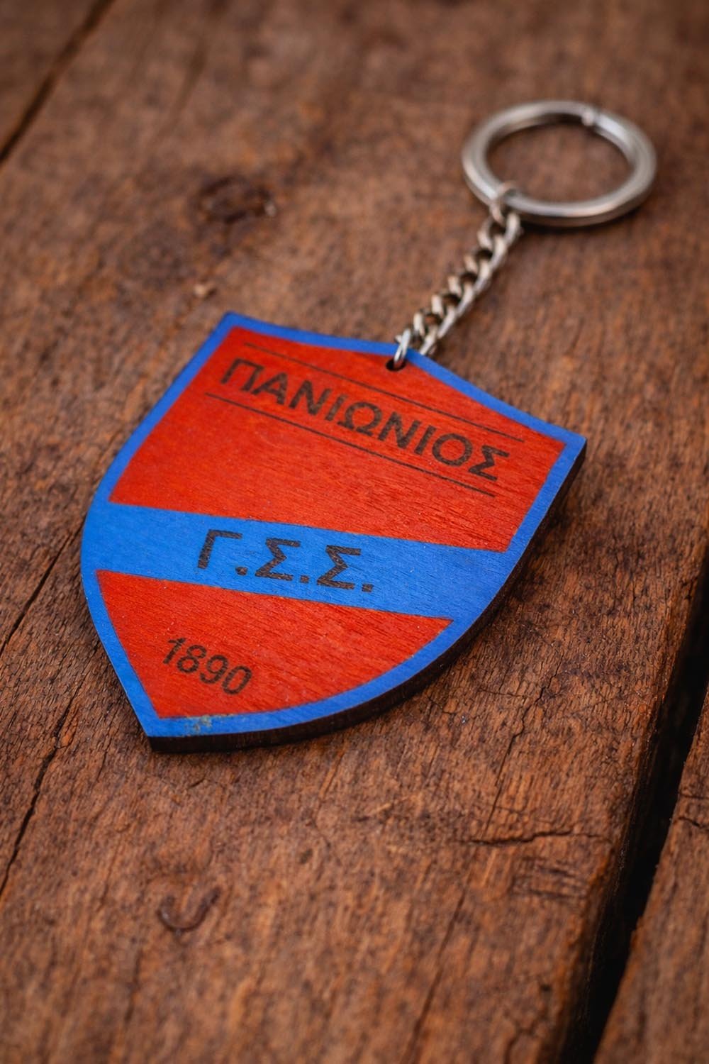 Το ξύλινο μπρελόκ με το κυανέρυθρο έμβλημα και το έτος 1890 αποτελεί ένα κομψό και συμβολικό αξεσουάρ για κάθε φίλαθλο Πανιωνίου.