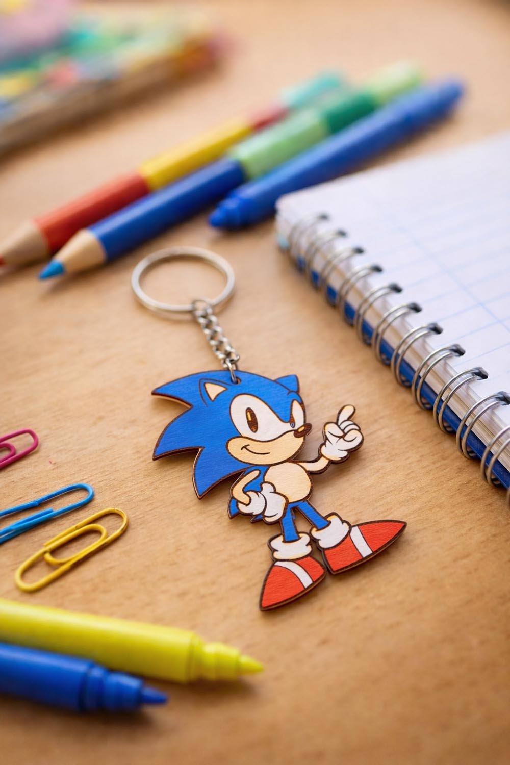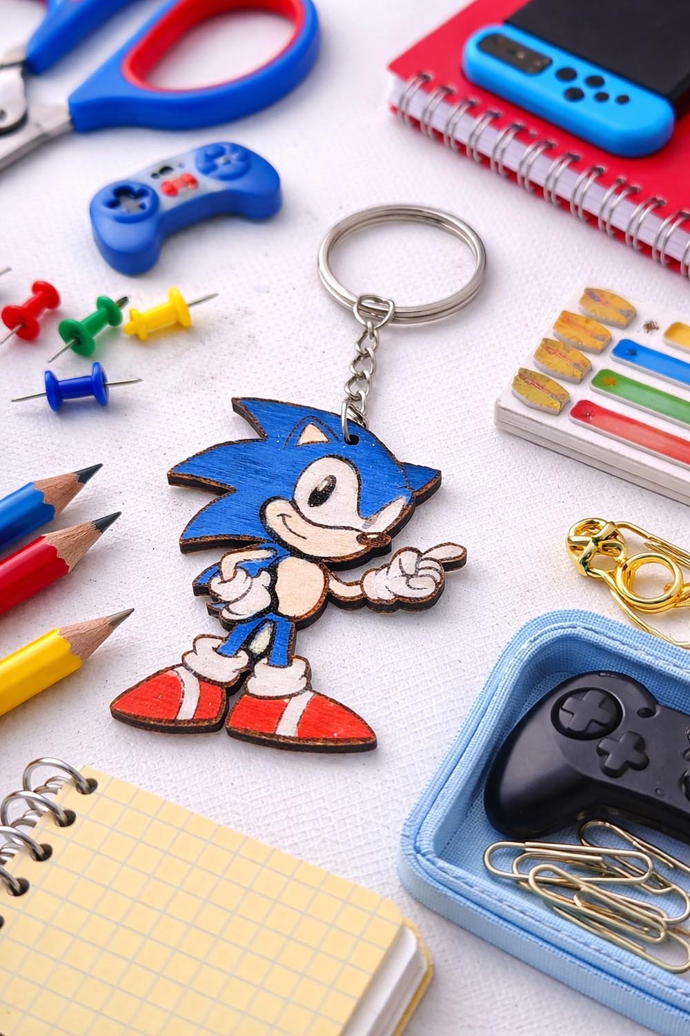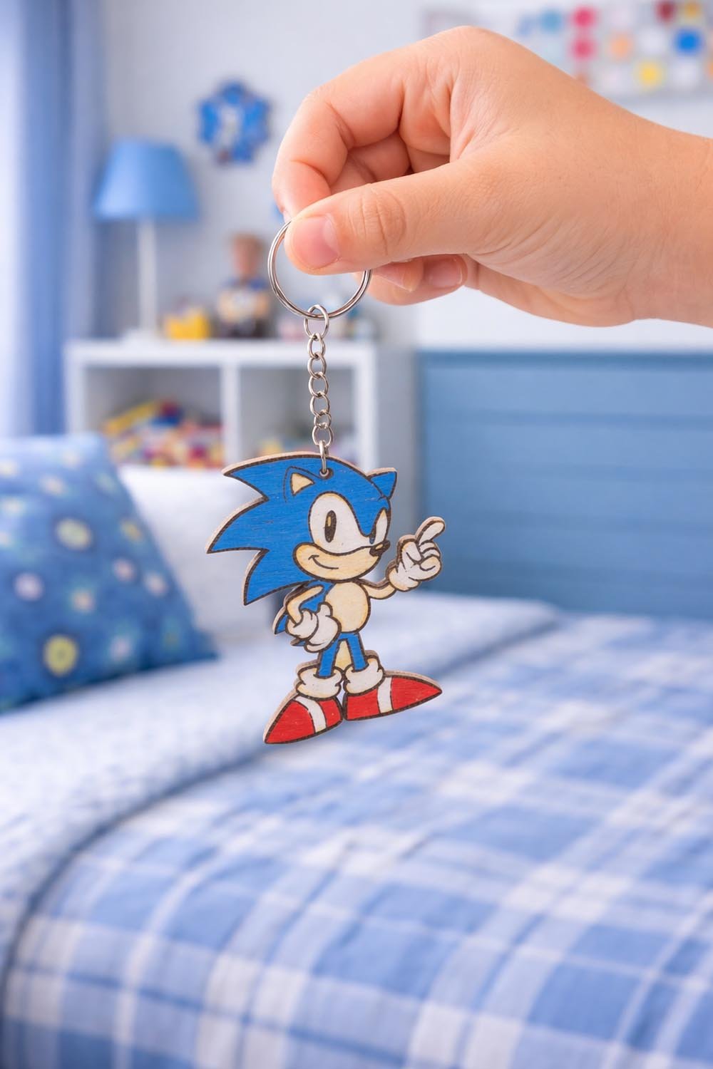 Ξύλινο μπρελόκ Sonic με χαραγμένο και βαμμένο στο χέρι σχέδιο. Ιδανικό για λάτρεις retro και gaming χαρακτήρων.