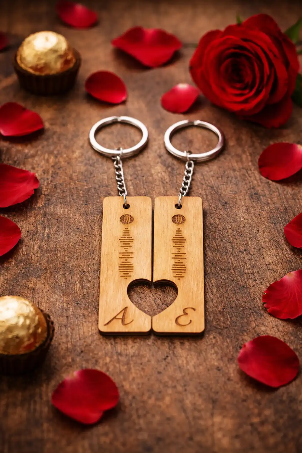 Σετ ξύλινα μπρελόκ για ζευγάρι με Spotify QR Code που οδηγεί στο αγαπημένο σας τραγούδι και χάραξη μονογραμμάτων. Προσωποποιημένο και ρομαντικό δώρο.