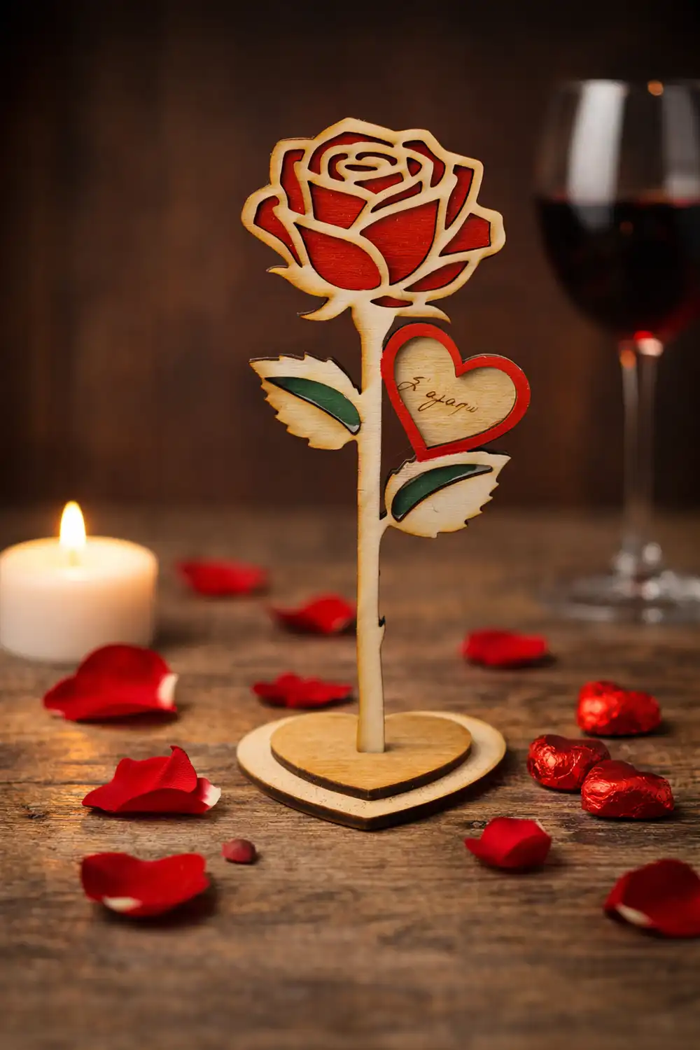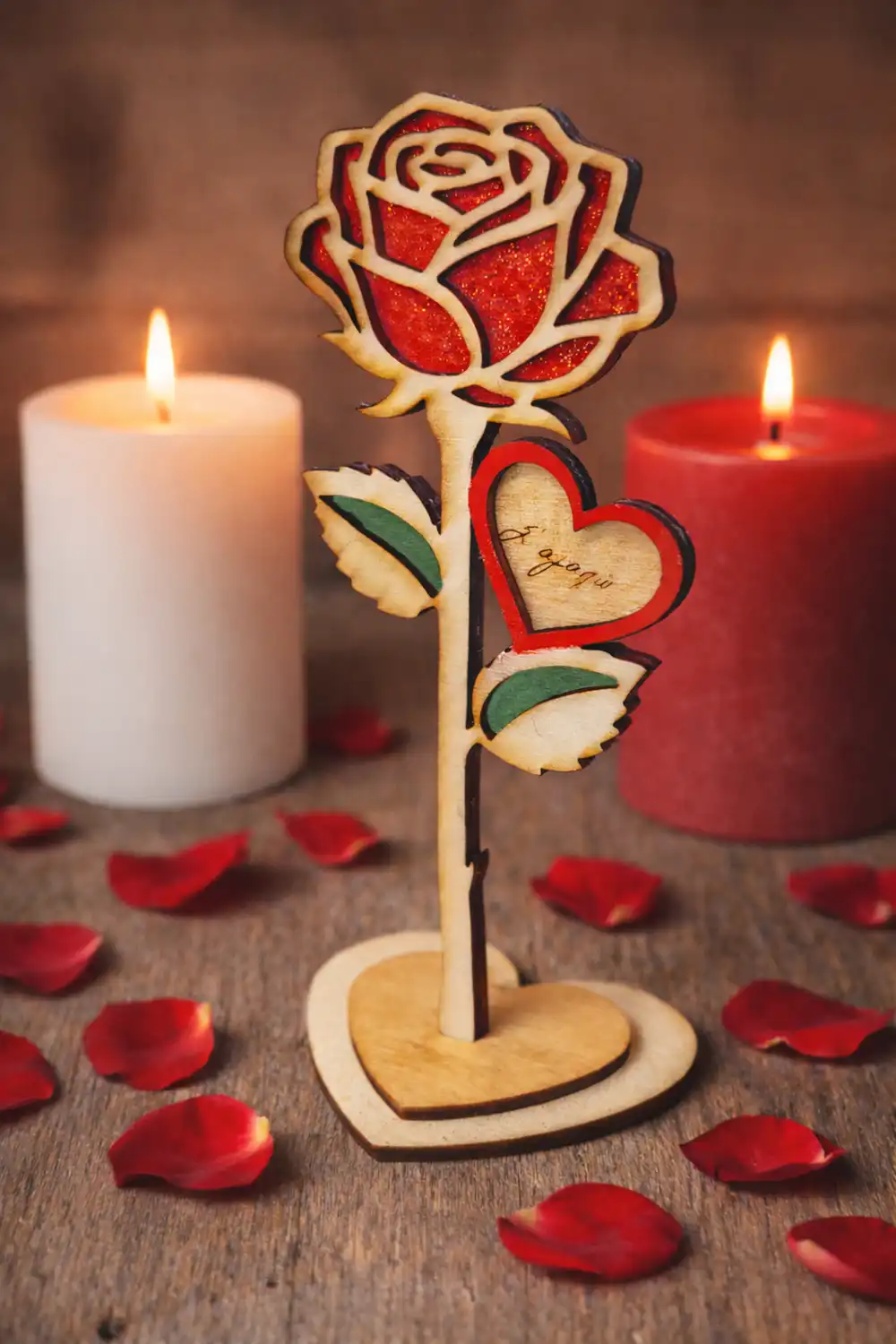 Ξύλινο επιτραπέζιο διακοσμητικό σε σχήμα τριαντάφυλλου με καρδιά και μήνυμα αγάπης. Ρομαντική επιλογή για δώρο και διακόσμηση χώρου. Υπάρχει δυνατότητα αλλαγής του μηνύματος με δικό σας προσωπικό!