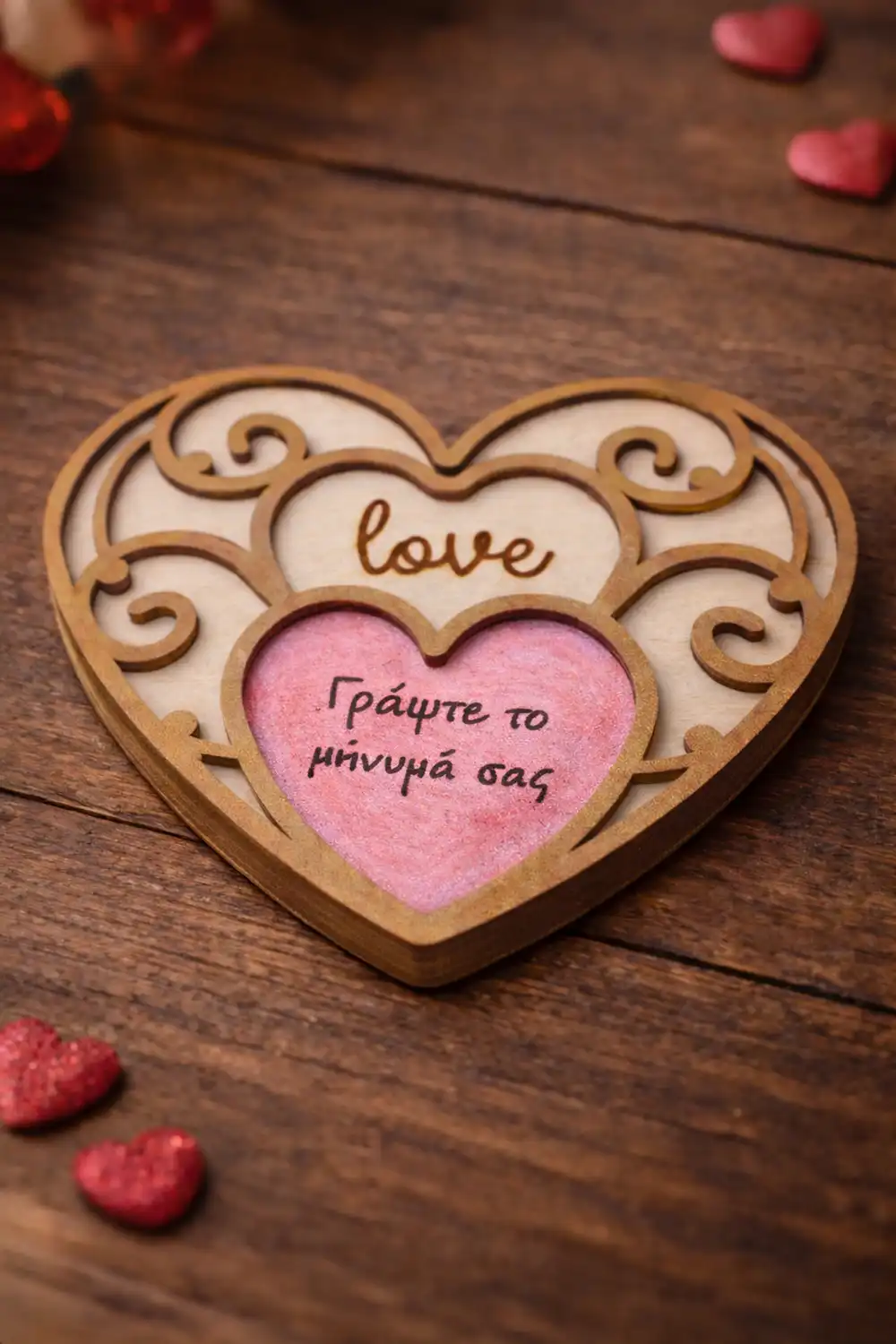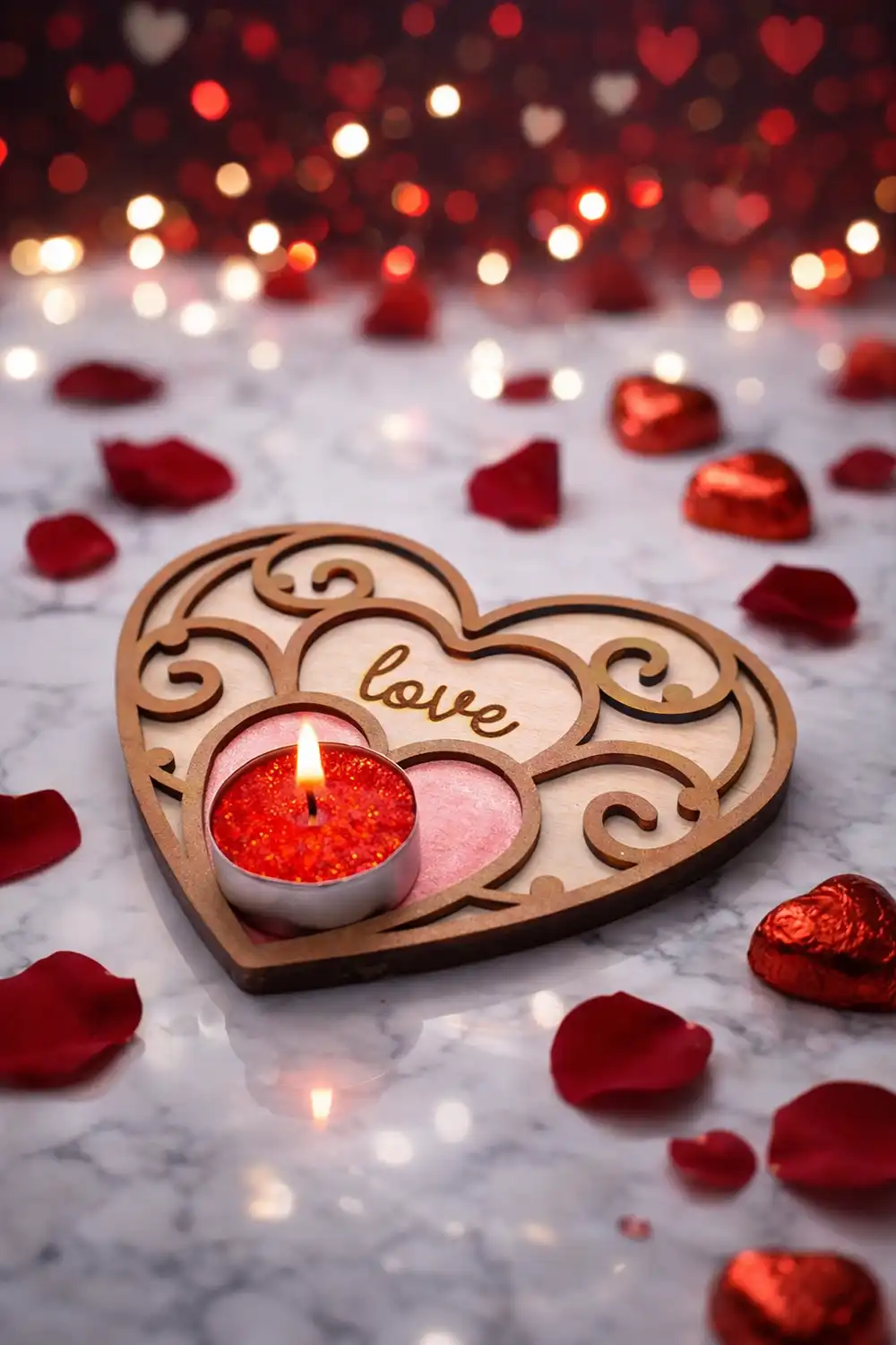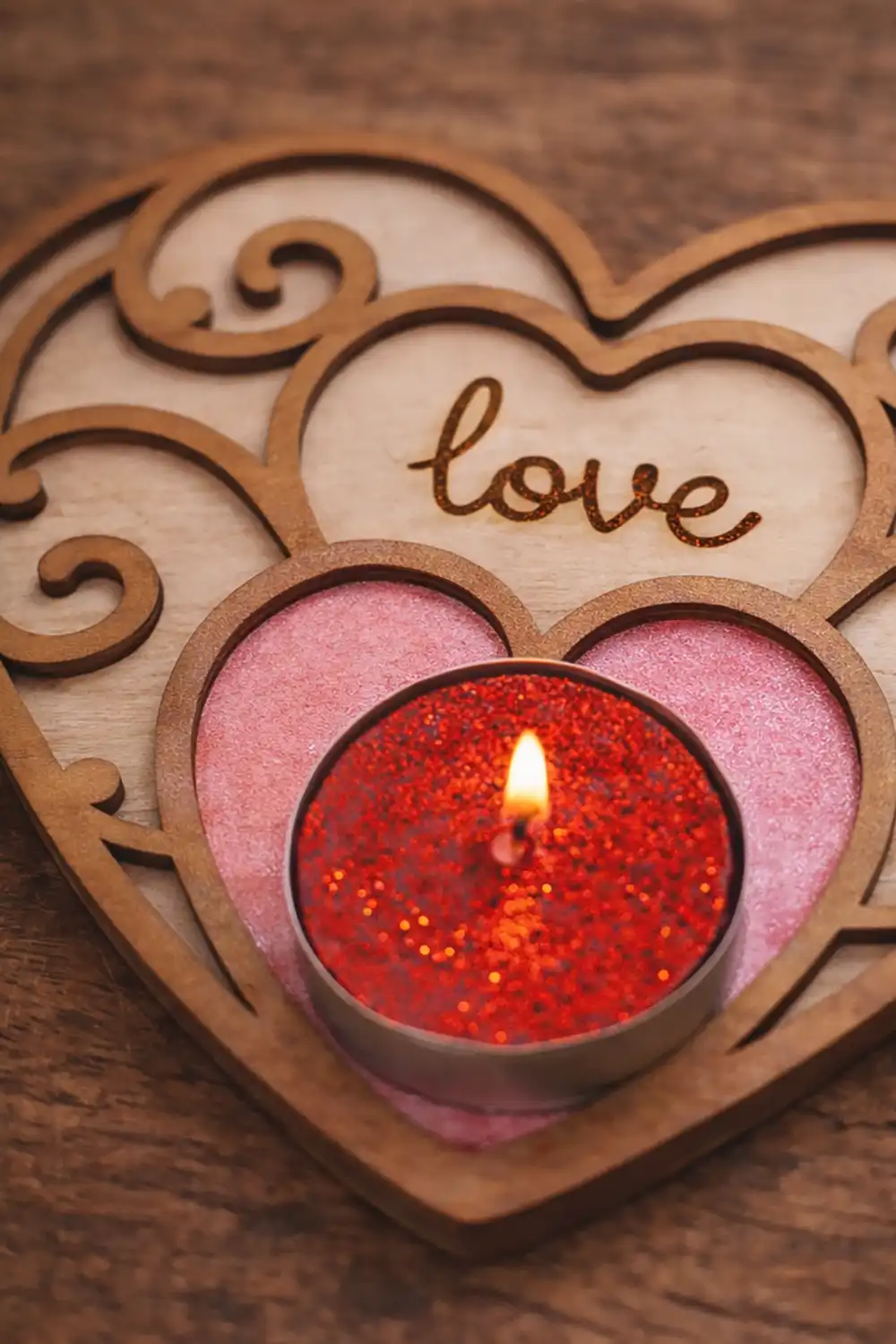 Το ξύλινο κηροπήγιο για ρεσό σε σχήμα καρδιάς με τη λέξη “love” και τα διακοσμητικά νερά δημιουργεί μια ρομαντική εικόνα που ταιριάζει σε κάθε χώρο 💕