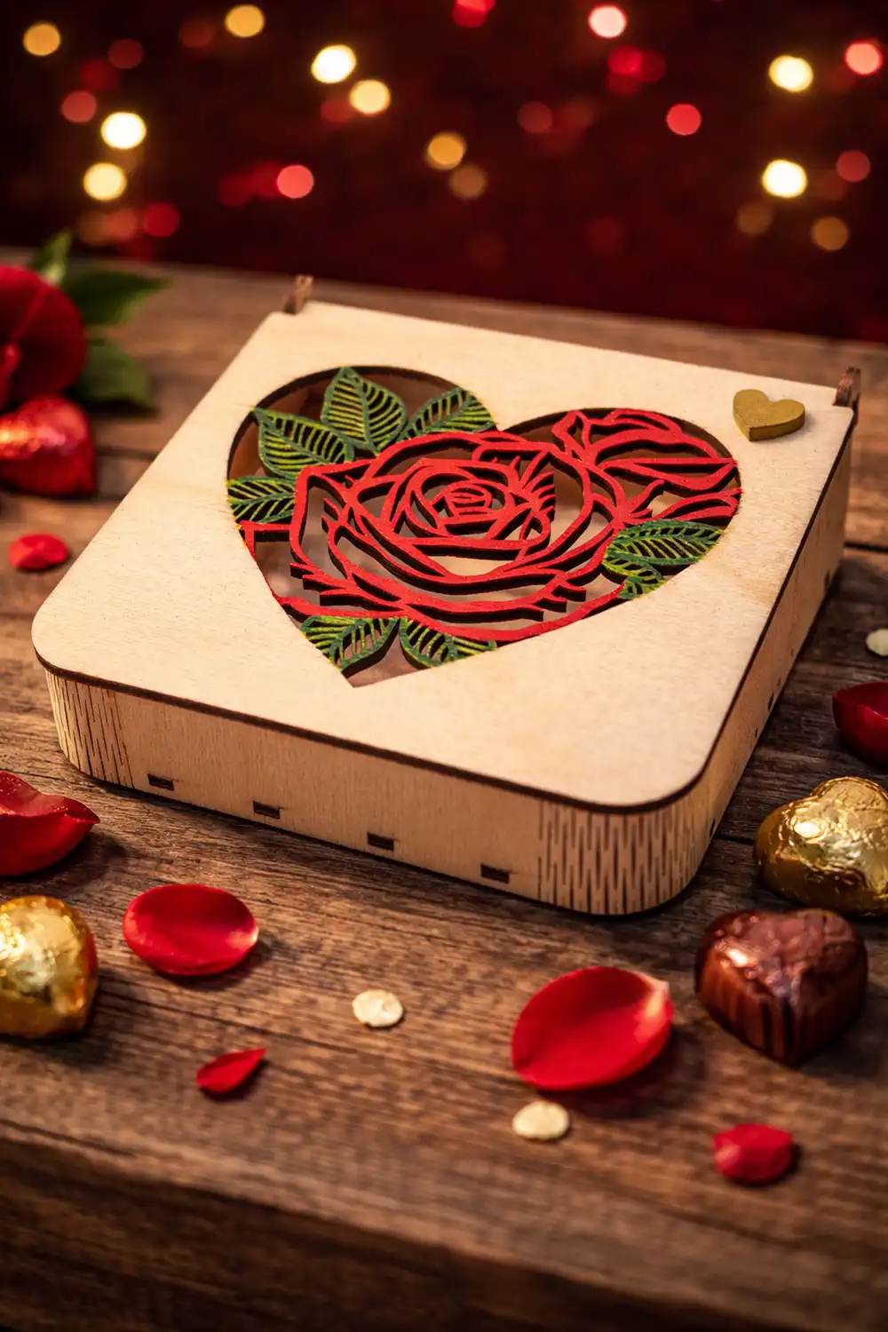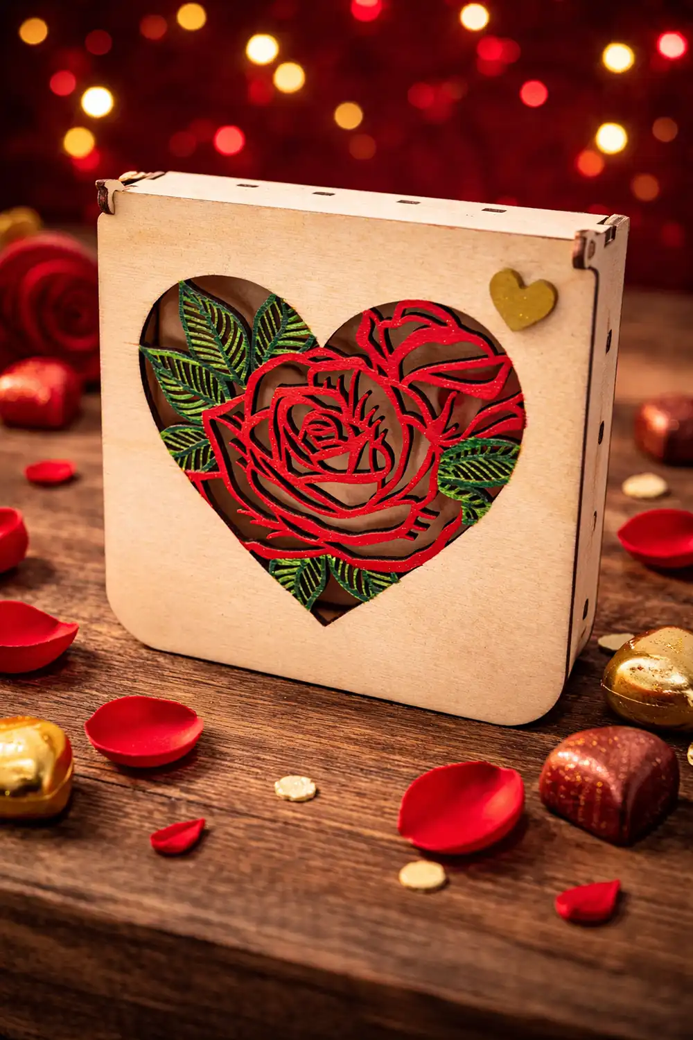 Το ξύλινο κουτί με το σχέδιο καρδιάς και τριαντάφυλλου δημιουργεί μια εικόνα αγάπης και τρυφερότητας, ιδανική για να φυλάξεις μικρά αντικείμενα με συναισθηματική αξία 💝