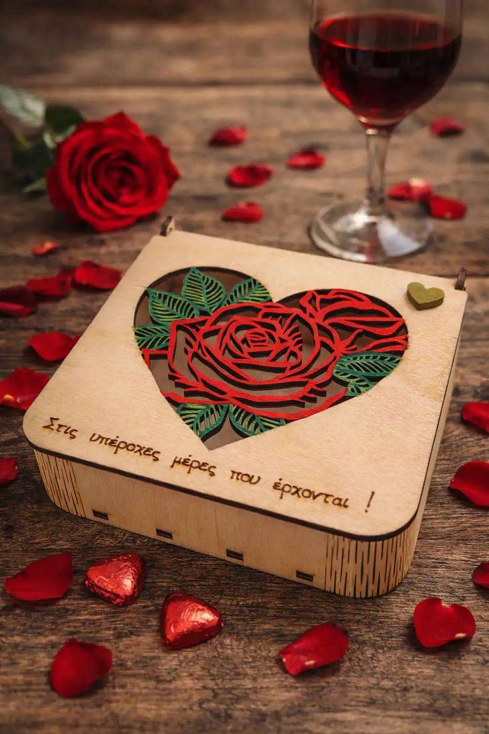 Ξύλινο κουτί με ρομαντικό σχέδιο καρδιάς και τριαντάφυλλου. Ιδανικό για δώρο και για αποθήκευση μικρών αντικειμένων ή αναμνηστικών. Υπάρχει η δυνατότητα χάραξης δικού σας μηνύματος !